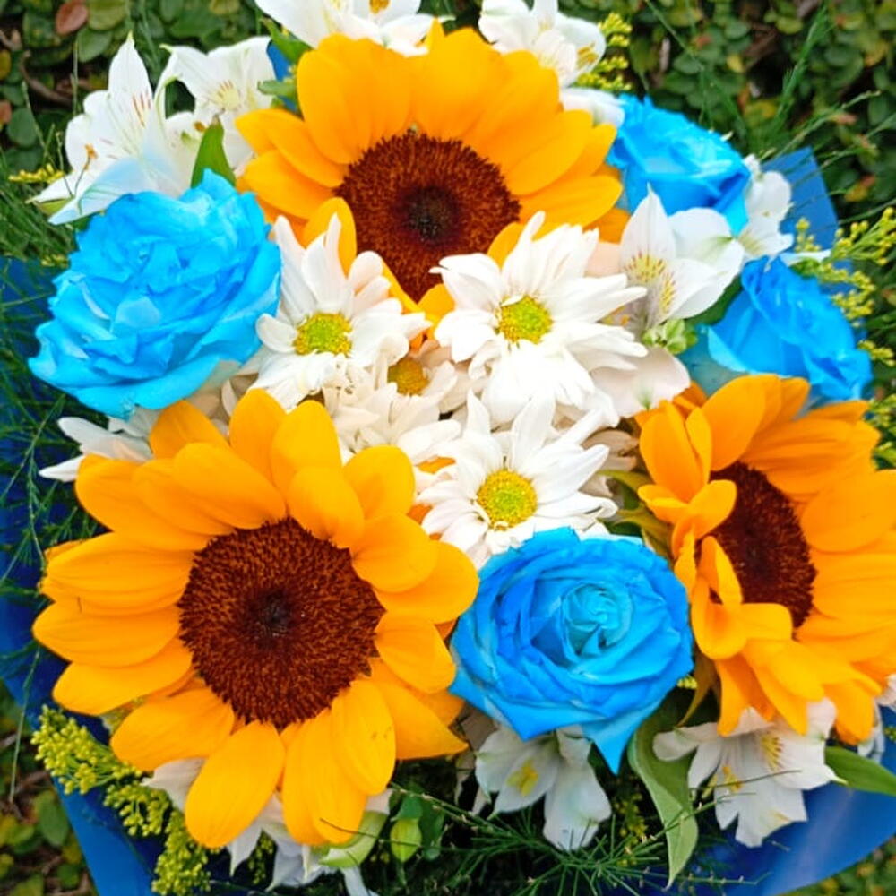 folhagem - 5 un. girassol - 3 un. astromelias - 6 un. rosa azul - 3 un. margarida branca - 4 un.