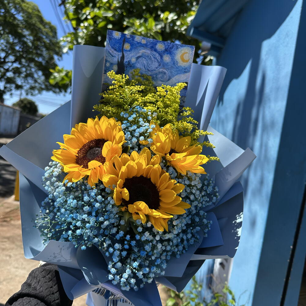 Este deslumbrante buquê é composto por 3 radiantes girassóis, junto com 5 unidades de delicada gipsófila azul e 5 hastes de tango vibrantes. Acompanha um encantador cartão com a célebre obra Noite Estrelada de Van Gogh, ideal para expressar sentimentos profundos. Tudo isso delicadamente embalado em uma embalagem tipo coreana, que adiciona um toque de sofisticação a este presente. É a escolha perfeita para quem deseja surpreender com elegância e bom gosto.