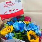 embalagem - 1 un. girassol - 4 un. caixa de rafaello - 1 un. laço - 1 un. astromélia azul - 5 un.