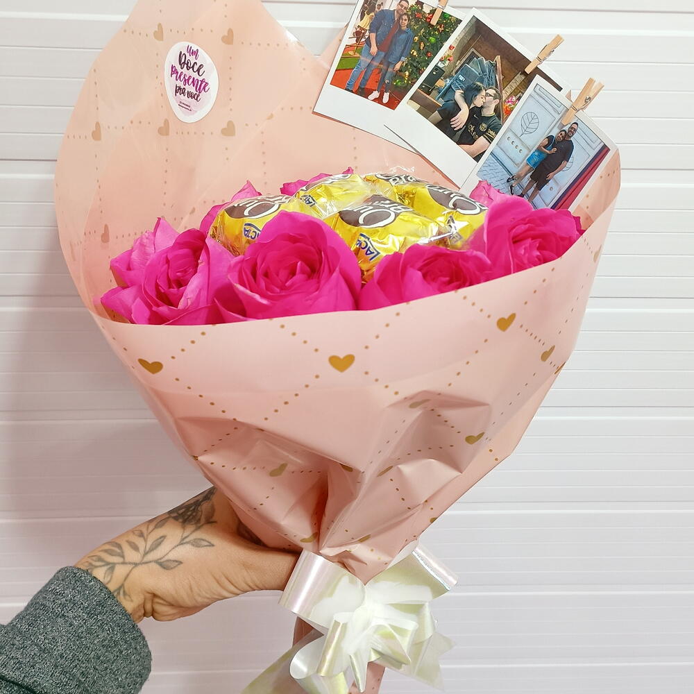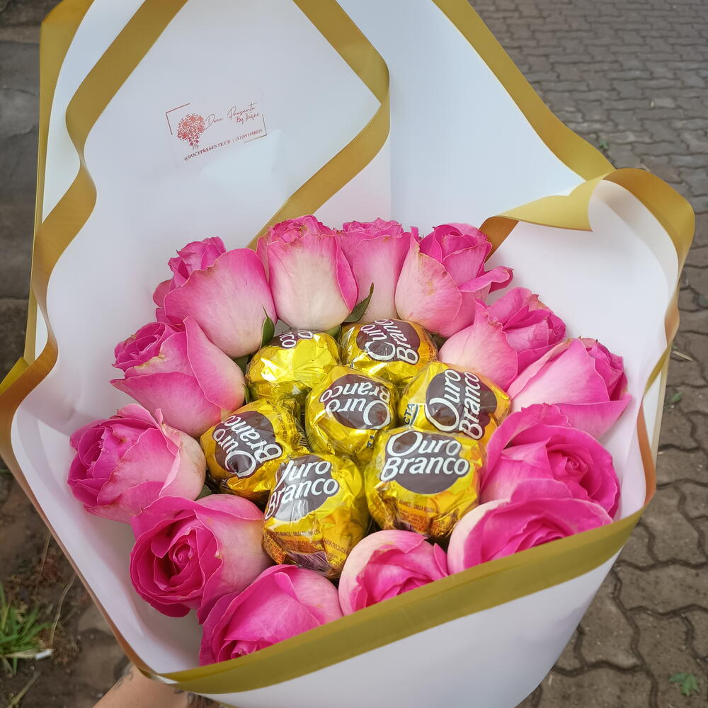 Este encantador buquê é feito com doze rosas cor de rosa naturais, representando o puro amor e admiração. O toque final na composição é dado por sete saborosos bombons, que você pode escolher entre Ouro Branco ou Sonho de Valsa. Um presente de bom gosto que combina a beleza das flores com o prazer dos doces. Este é o presente perfeito para tornar qualquer ocasião especial.