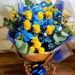 Linda opção de presente personalizado é este buquê de rosas Amarelas e flores azul e amarela compondo a menção a obra Noite Estrelada de Vangogh.
