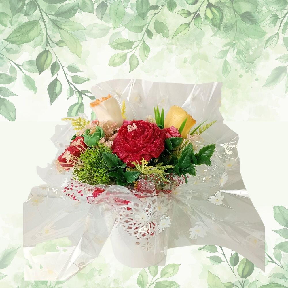Lindo Buque de velas e cera aromáticas que trazem a beleza, o aroma e a durabilidade de um arranjo feito para oferecer uma experiência mais longa a quem recebe, remetendo a lembranças deste momento por mais tempo. Ideal para dia das mães, dia das mulheres, dia da secretária, aniversário, bodas diversas, casamentos, batizados, nascimentos.