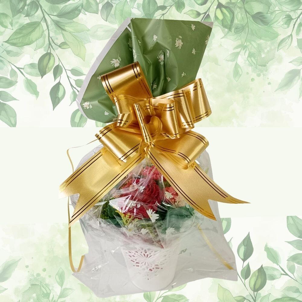 laço dourado - 1 un. vela peônia com pavio algodão e aroma premium - 1 un. vela botão de rosa com pavio algodão e aroma premium - 2 un. vela rosa formato coração com pavio algodão e aroma premium - 1 un. cera aromática mini rosinhas cera coco e aroma premium - 3 un. arranjo de flor e folhas permanente - 1 un. involucro transparente com ponta estampada folhas verdes - 1 un.