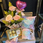 caneca - 1 un. almofada - 1 un. mini balão - 1 un. palha decorativa - 1 un. chocolate ferrero rocher 8 bombons - 1 un. arranjo de flores naturais com folhagens e embalagem - 1 un. caixa de madeira com tampa - 1 un.