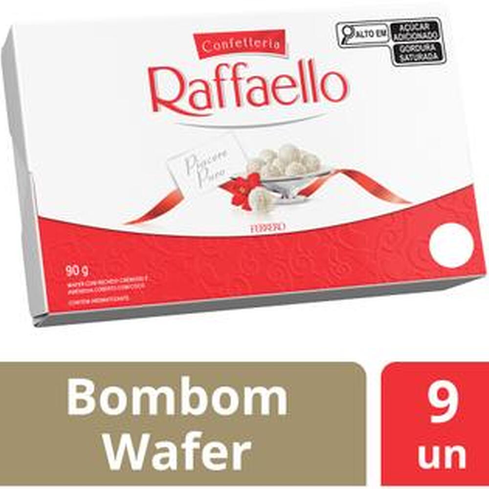 A receita do Bombom Wafer Raffaelo Confetteria é uma harmoniosa combinação de ingredientes únicos e cuidadosamente selecionados. Possui um sabor delicado e esconde um intenso prazer revelado na primeira mordida. Uma amêndoa inteira dentro de um delicioso recheio cremoso, envolto de uma casquinha de wafer crocante coberta com suaves flocos de coco. A Caixa de bombom é de 90g, com 9 unidades. Surpreenda-se com Raffaello! Para os alérgicos, contém amêndoas e derivados de leite, trigo e soja. Contém lactose. Contém glúten.