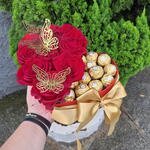 rosa colombianas - 12 un. bombons ferrero rocher - 12 un. caixa cartonada coração - 1 un. laço decorativo - 1 un. boletas dourada - 3 un.