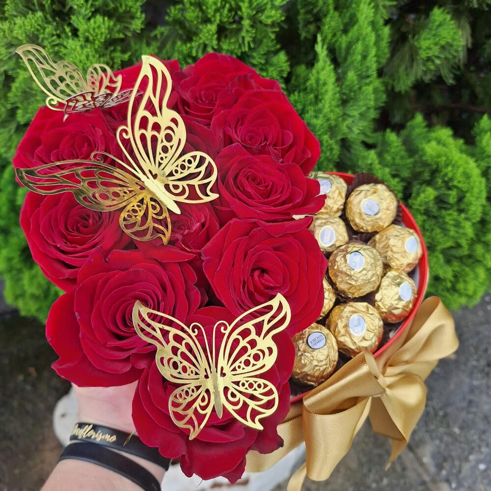 1 Caixa Cartonada Coração 12 Rosas Colombianas 🌹 3 Borboletas Dourada 12 Ferrero Rocher Lindo laço