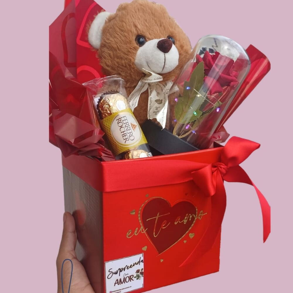 embalagem - 1 un. rosa encantada - 1 un. ferrero rocher com 3 unidades - 1 un. box decorada com laço - 1 un. pelucia original - 1 un.