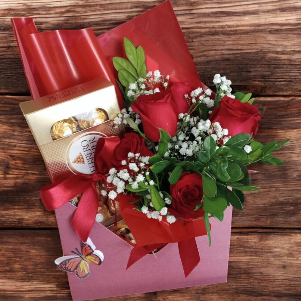 rosa vermelhas - 5 un. caixa de ferrero rocher com 8 unidades - 1 un. caixa envelope decorada - 1 un.