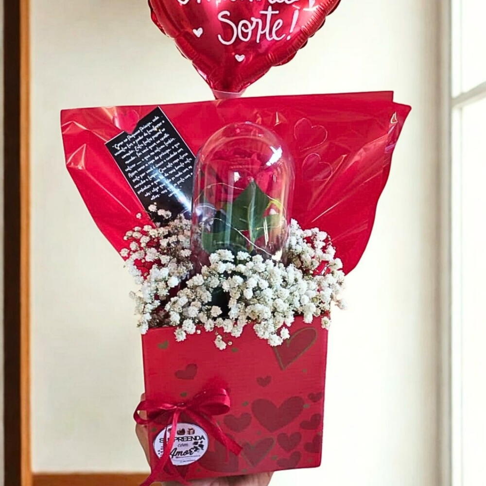 caixa decorada - 1 un. rosa encantada - 1 un. balão com frase - 1 un. gipsofila natural florzinhas brancas - 6 un.