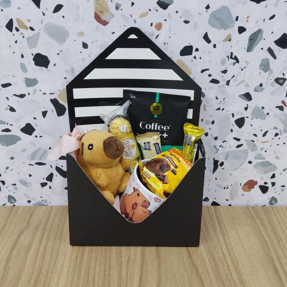 Presente encantador para presentear, contendo uma caixinha com pelúcia de capivara, uma caneca Capivara, Chocolates, bolinho e um deliciosa café para passar direto na sua caneca.