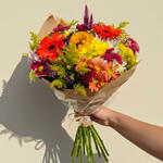 folhagens - 1 un. flores mistas - 1 un. laço rústico - 1 un. embalagem karft e transparente - 2 un.