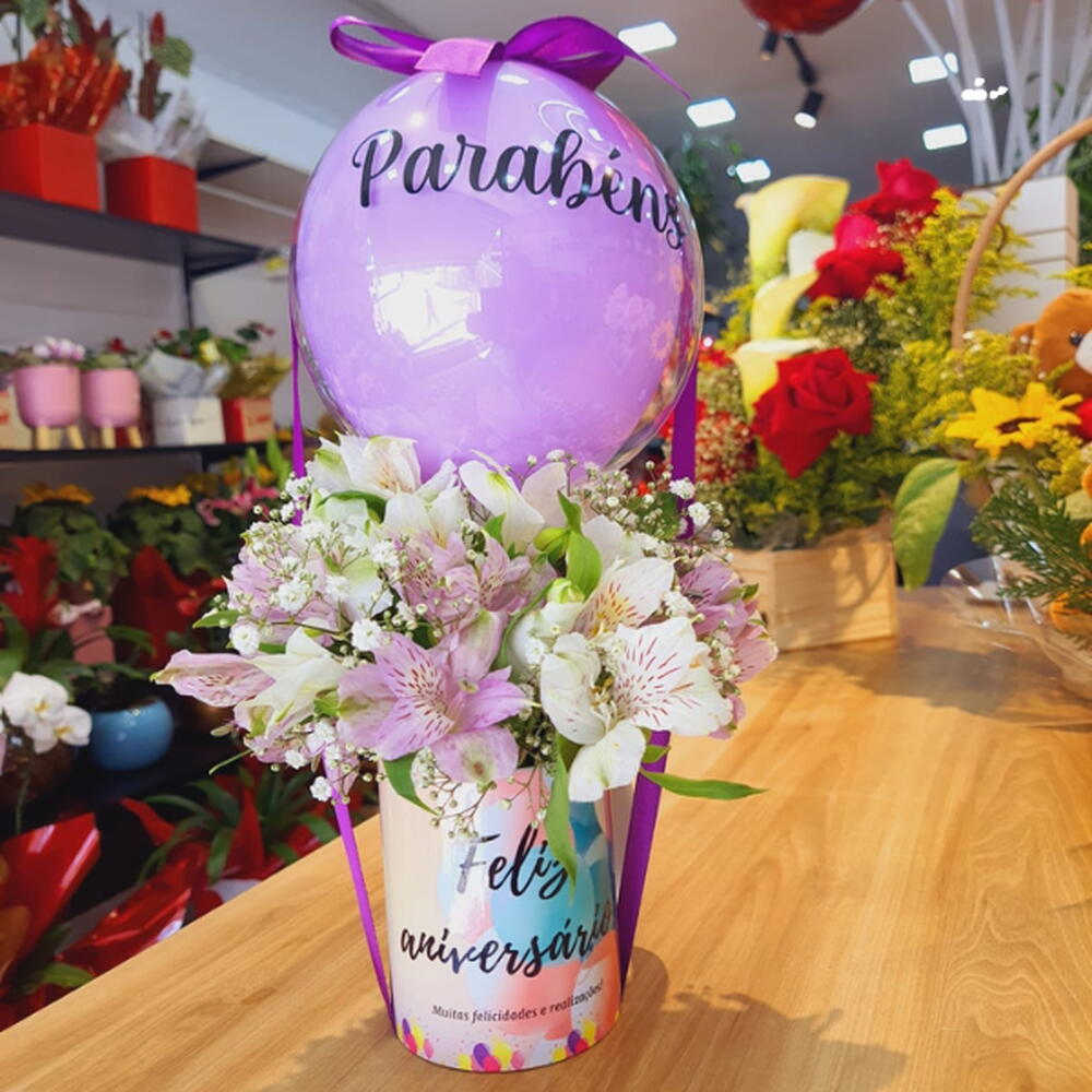 Este arranjo de flores elegante combina a pureza das astromélias brancas e a sutileza das astromélias lilás em um total de 6 unidades. Vem acompanhado por uma caneca de estética agradável e uma unidade de bubble pequeno. Uma composição delicada que expressa carinho, beleza e amor em cada detalhe. Ideal para ocasiões especiais ou simplesmente para adicionar um toque de natureza à sua casa.