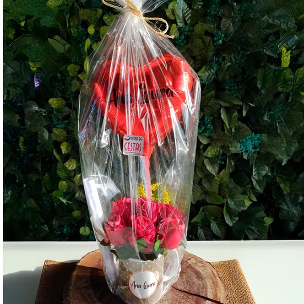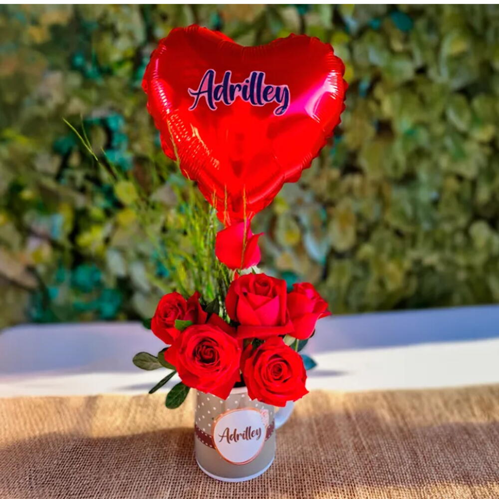 Descrição do Produto: Caneca Florida Personalizada com Arranjo de Rosas Vermelhas, Cartinha Com Mensagem e Balão Adesivado Surpreenda quem você ama com a nossa exclusiva Caneca Florida! Este presente único inclui uma caneca de porcelana branca personalizada com o nome ou frase à sua escolha, trazendo um toque especial e personalizado para quem a recebe. Acompanha um elegante arranjo com 6 rosas vermelhas frescas, combinadas com folhagens naturais, proporcionando um visual sofisticado e romântico. Para tornar o presente ainda mais especial, incluímos uma cartinha personalizada: editamos a sua mensagem com fonte manuscrita, imprimimos em folha ofício decorada de acordo com o tema escolhido, enrolamos delicadamente e fechamos com um laço de fita de cetim, trazendo um charme artesanal que encanta. Além disso, o conjunto inclui um balão personalizado adesivado com o nome desejado, adicionando um toque divertido e exclusivo ao presente. É o kit perfeito para celebrar datas especiais como aniversários, Dia dos Namorados, aniversários de namoro ou simplesmente para surpreender aquela pessoa especial!