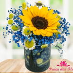 Lindo Arranjo de girassol e gipciofila azul dentro de uma caneca de porcelana com a estampa na obra de arte Noite Estrelada do Pintor Vangogh.
