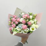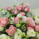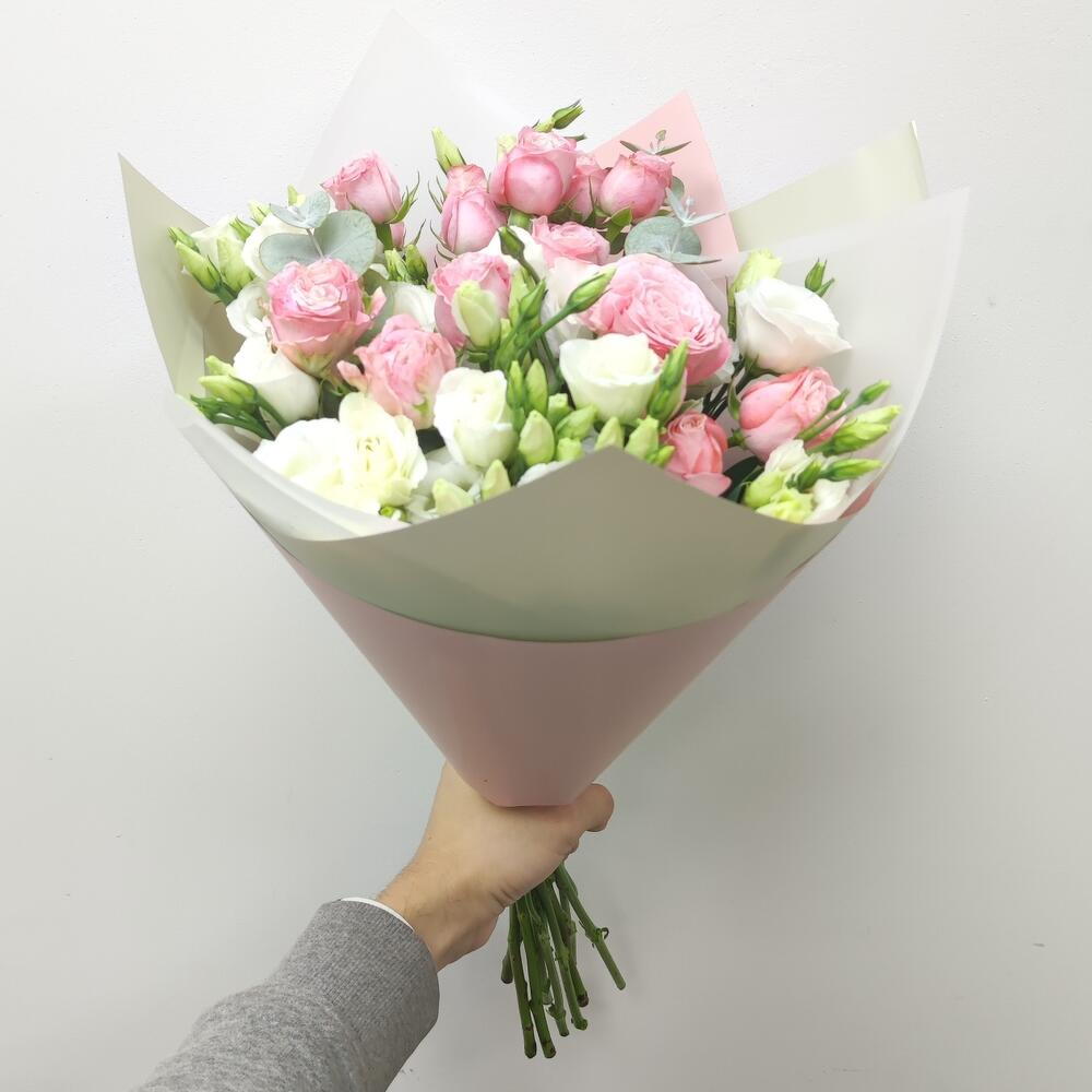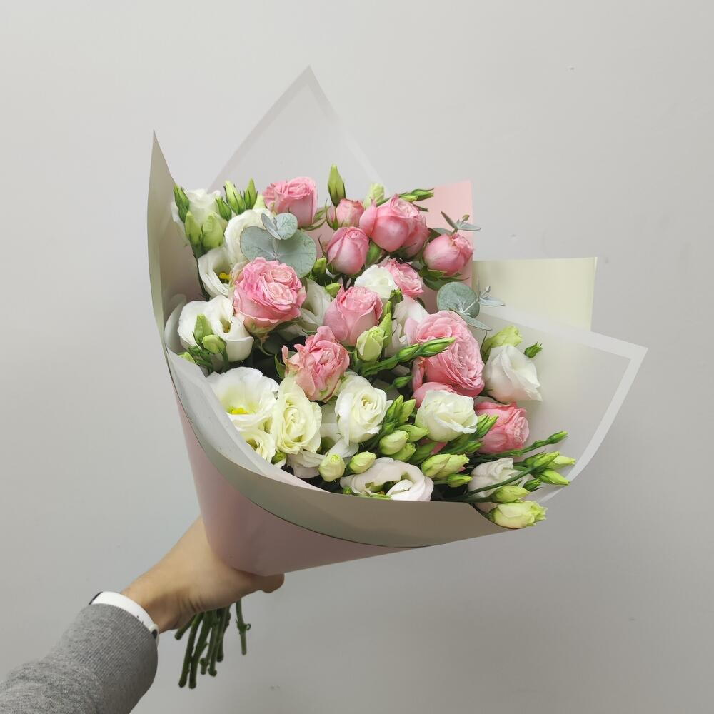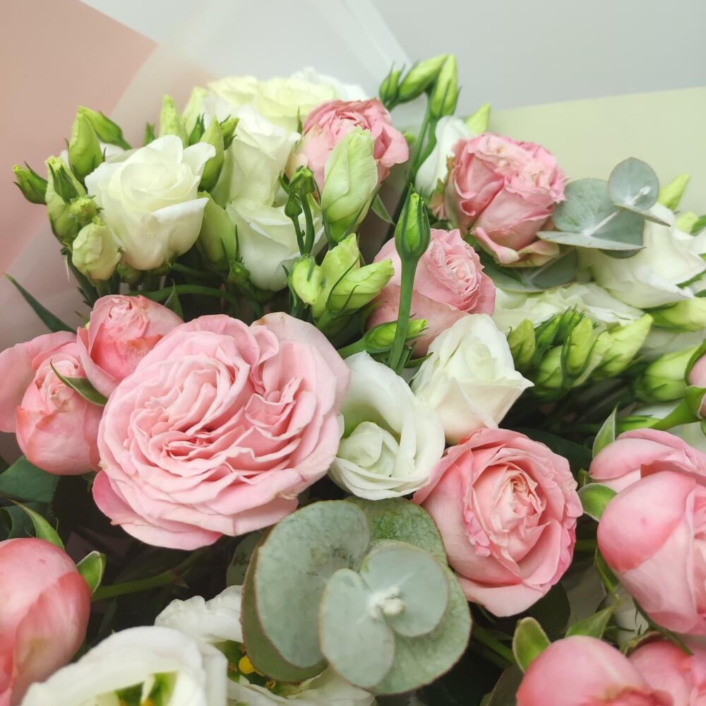 rosa - 3 un. fita de cetim - 1 un. eucalípto - 1 un. embalagem - 2 un. eustoma - 2 un.
