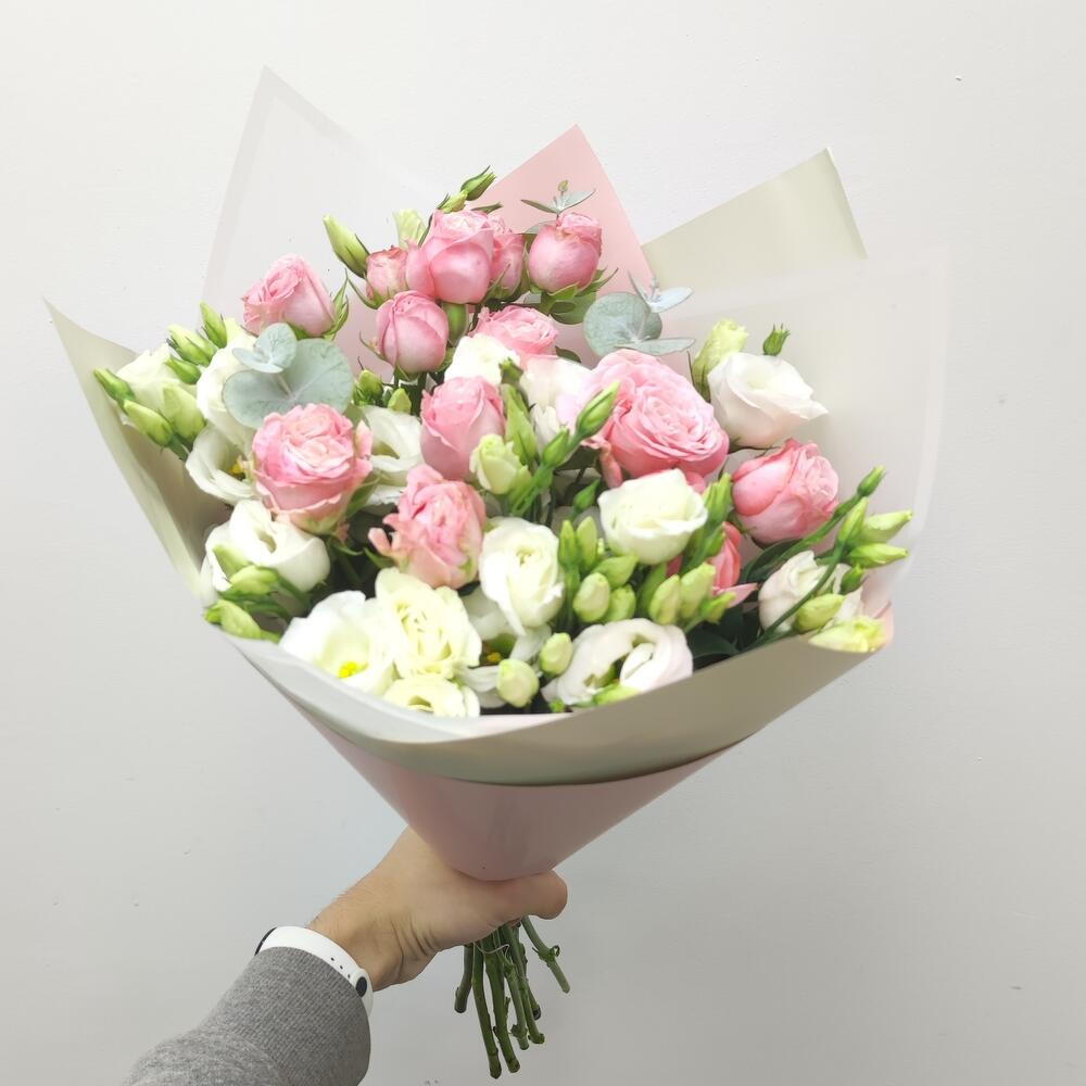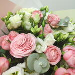embalagem personalizada - 1 un. rosa brancas - 12 un. rosa cor-de-rosa - 14 un. decoração com ramos verdes - 1 un.