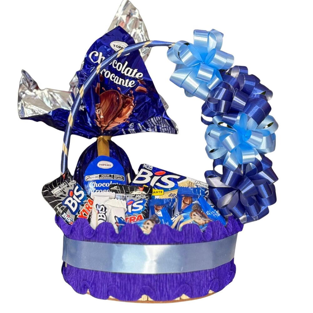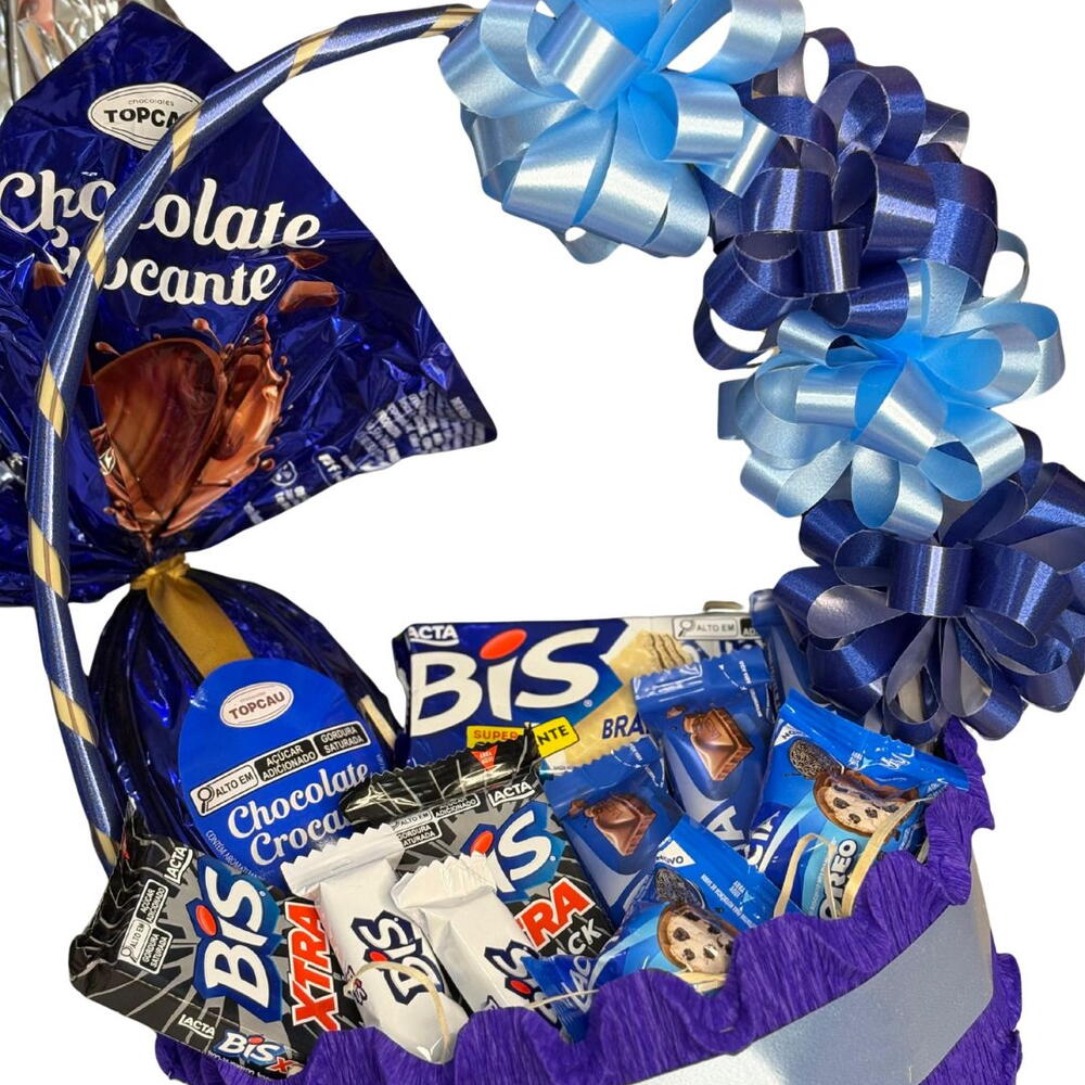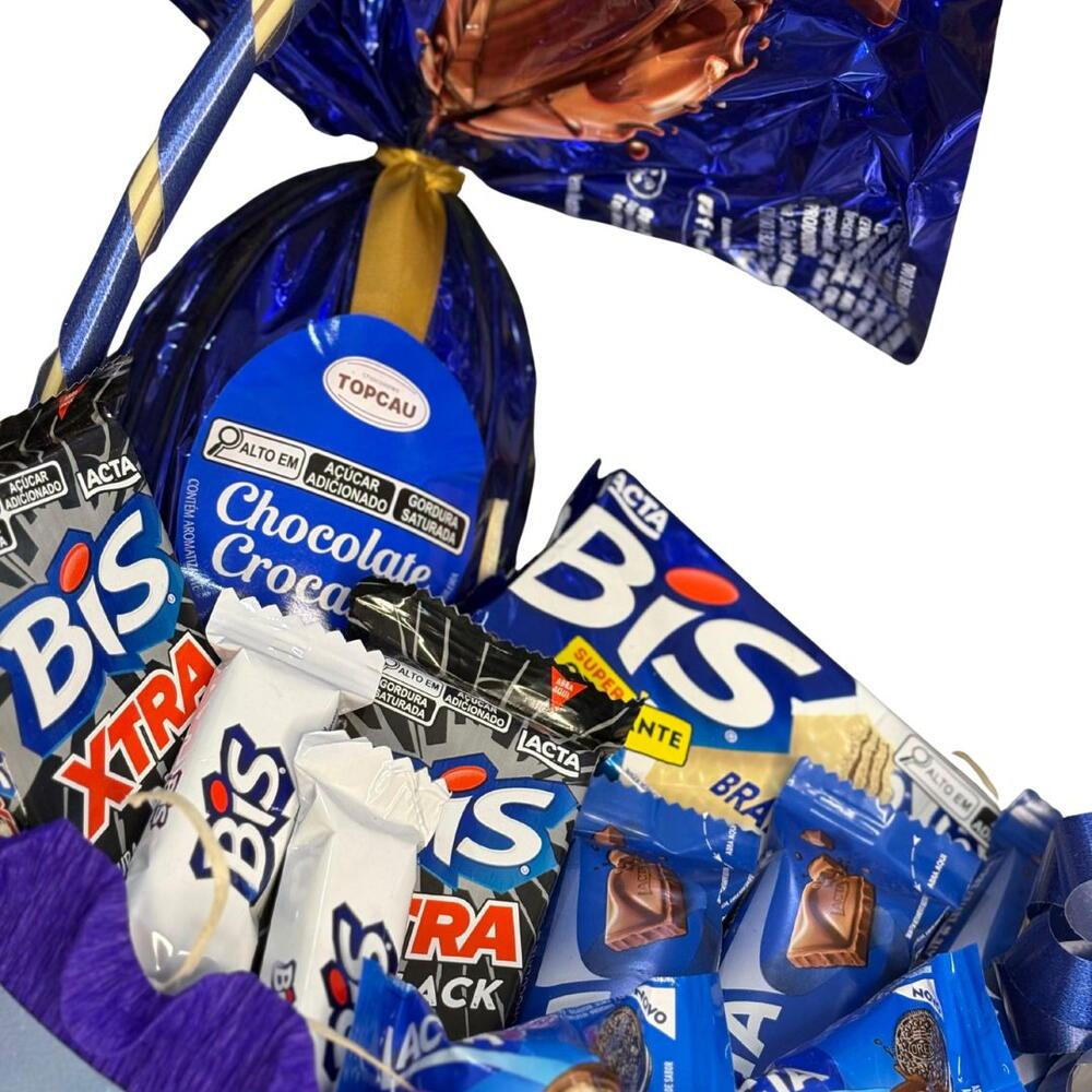caixa bis - 1 un. laço - 1 un. bombons variados - 7 un. saco celofane - 1 un. cesta decorada - 1 un. bis xtra - 2 un. ovo de páscoa topcau - 1 un.