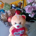 cesta - 1 un. arranjo de flores - 1 un. pelucia - 1 un. itens cafe da manha - 10 un.
