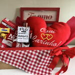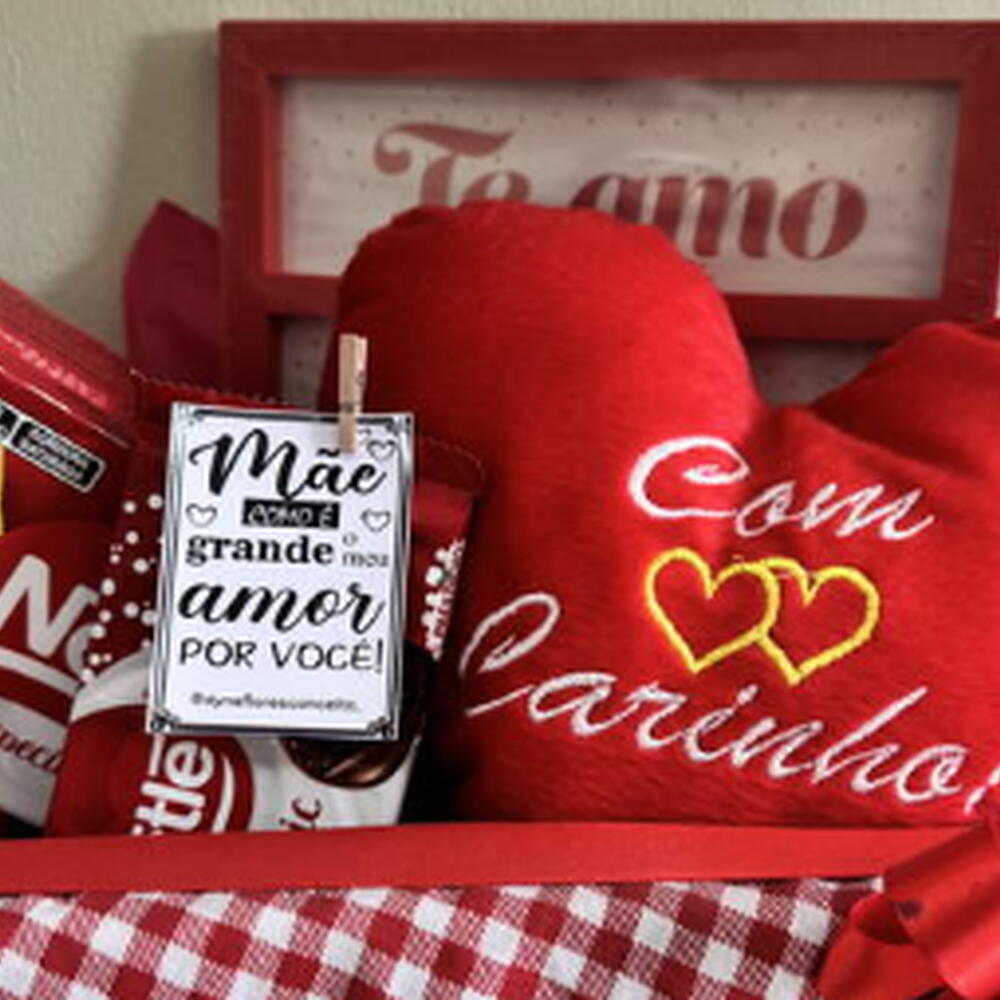 cartão mensagem - 1 un. cesta decorada - 1 un. barra de chocolate nestlé - 1 un. porta retrato criativo - 1 un. almofada coração com carinho - 1 un. tag tematica - 1 un. caixa chocolate nestlé - 1 un.