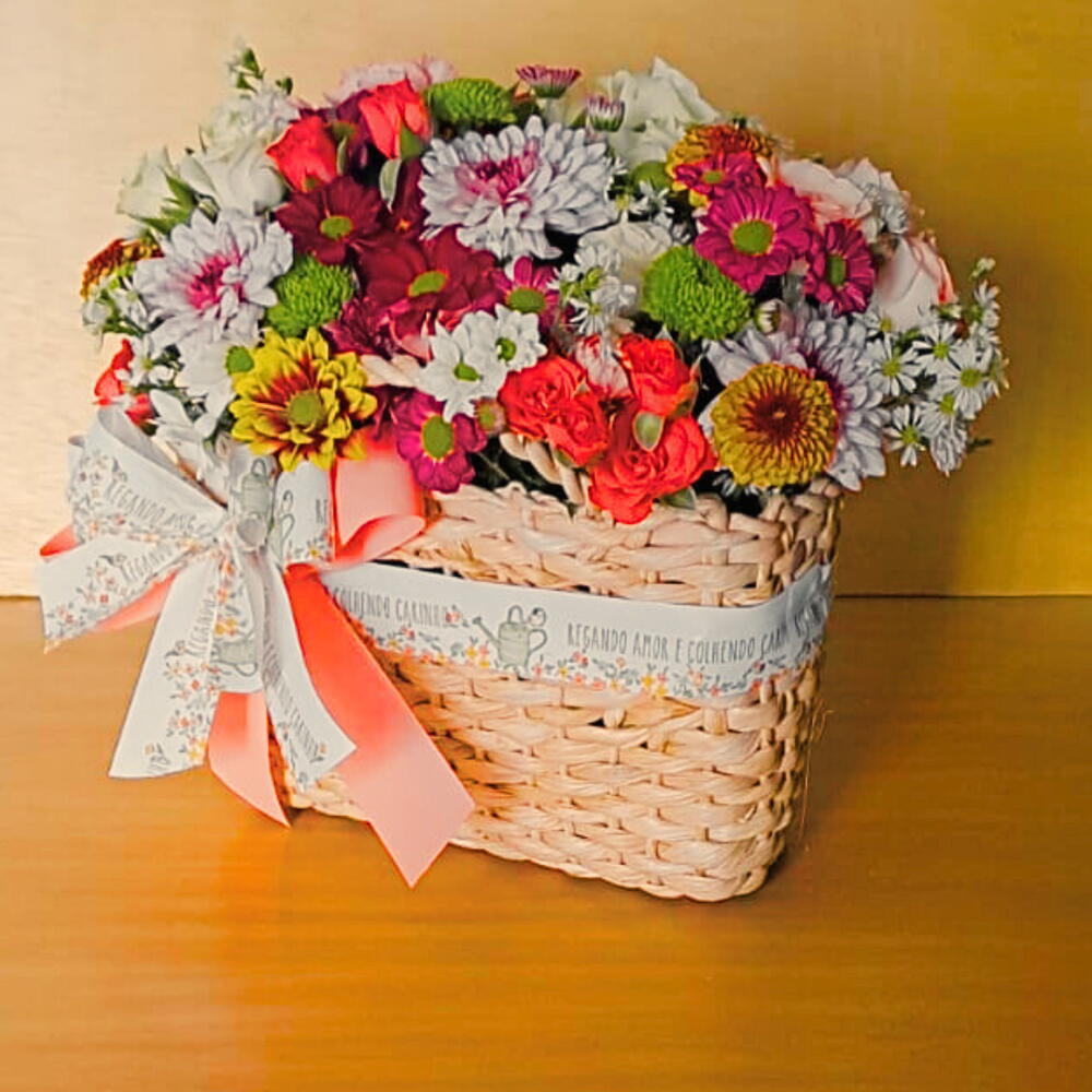 Cesta com Flores Regando Amor e Colhendo Carinho