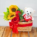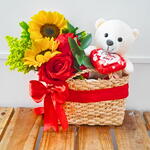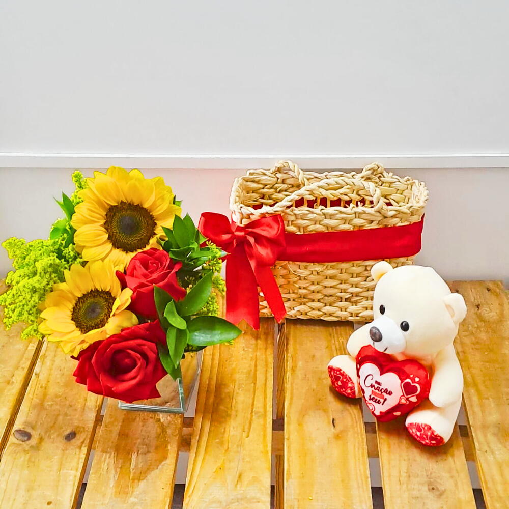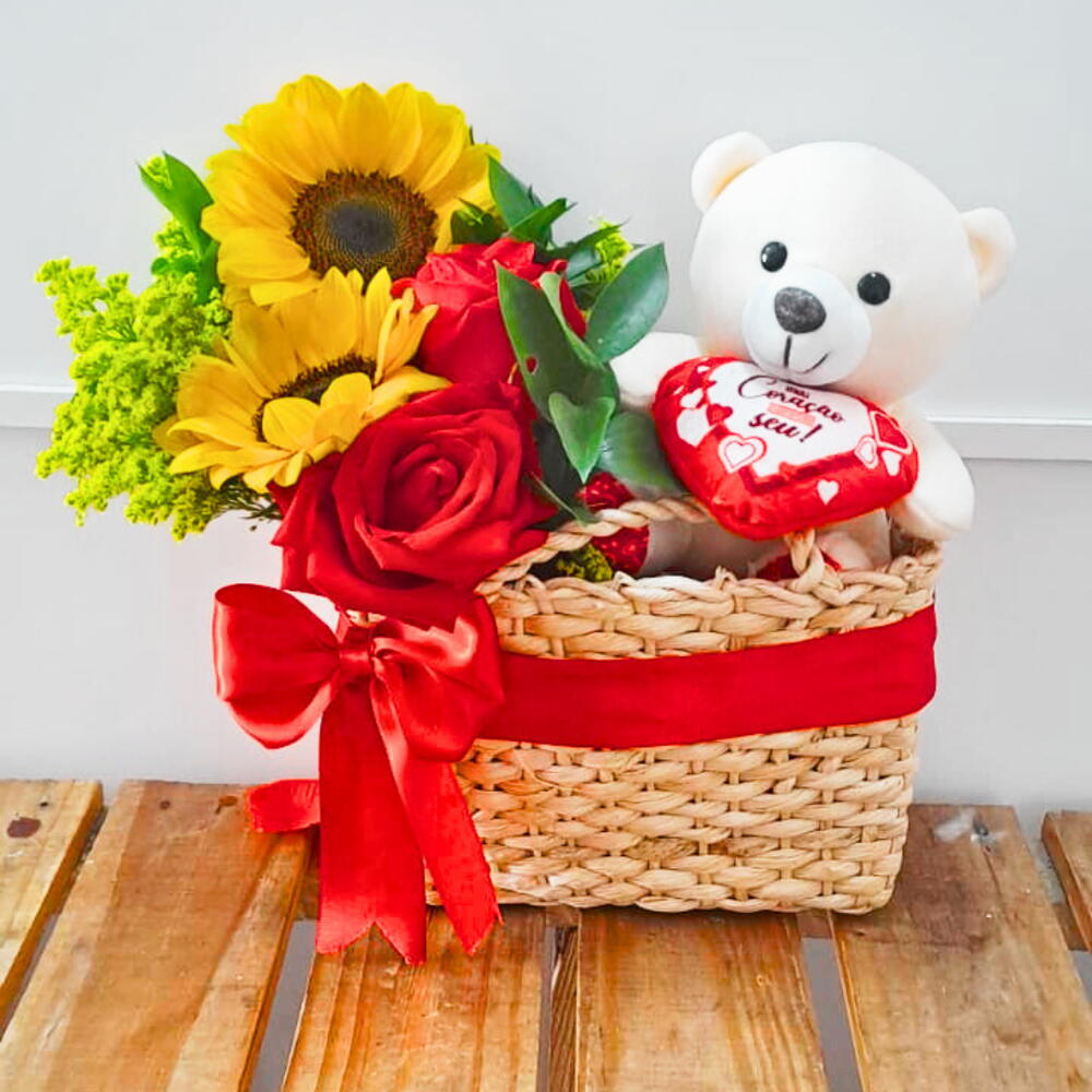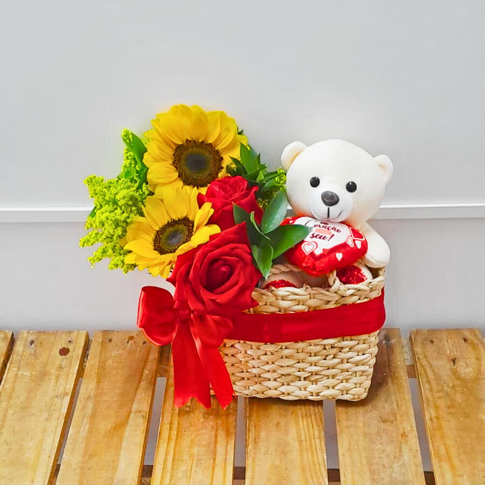 cesta de palha - 1 un. arranjo com girassol e rosa - 1 un. urso pelúcia 15 cm - 1 un.