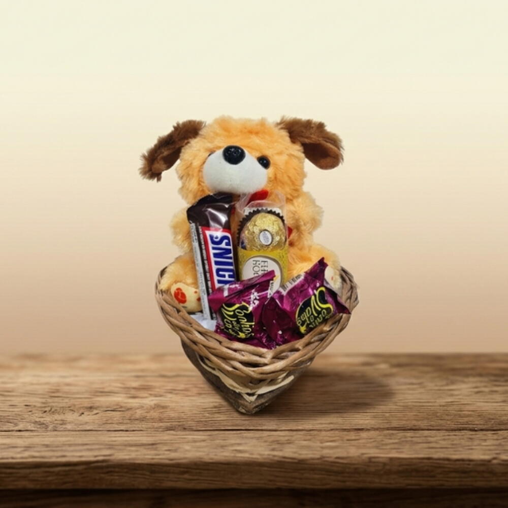 chocolate snickers - 1 un. embalagem final com celofane transparente e fita decorativa - 1 un. pelúcia cachorrinho ou panda 20 cm com acabamento premium - 1 un. cesta em formato coração pequena em fibra natural - 1 un.