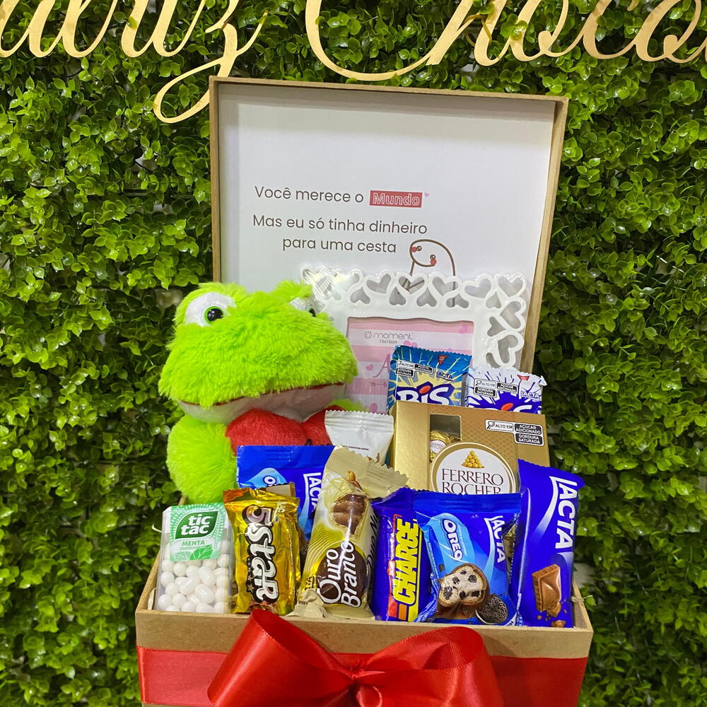 Presenteie seus entes queridos com este kit de Presente com Chocolate, que é uma combinação perfeita de doçura e carinho. Este kit inclui uma unidade de Tic Tac para um sabor refrescante, sete deliciosos bombons para adoçar o dia, uma unidade de porta retrato para guardar memórias preciosas, um laço elegante para um toque de sofisticação e um saco de celofane conveniente. Há também duas unidades do irresistível Bis Xtra para um prazer extra, uma caixa decorada de MDF para dar um toque especial, uma pelúcia fofinha de 22cm para um abraço caloroso e quatro unidades da luxuosa Caixa Ferrero Rocher T4 para um final indulgente. Este é realmente o presente perfeito para demostrar amor e apreciação.