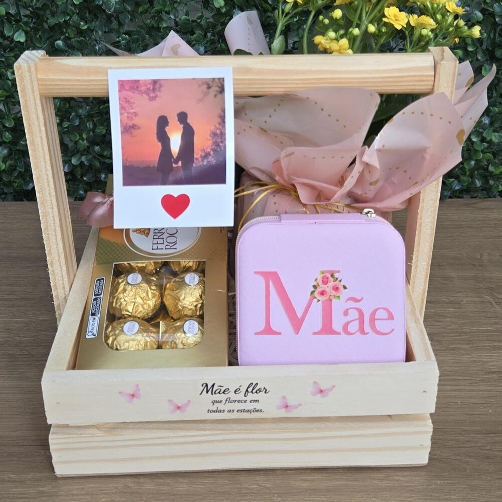 Caixote reutilizável em Madeira Pinus tamanho 20x15 personalizado especial dia Das Mães, Ferrero rocher decorado 8 unidades, vaso de flor tipo kalanchoe com embalagem presenteável ( cor conforme disponibilidade), 1 foto polaroid e 1 porta Joias personalizado ( consultar frases personalizáveis disponíveis) . Inclui embalagem e tag especial Dia Das Mães! * Produto sujeito a disponibilidade de estoque, não deixe o pedido para última hora e garanta esse presente incrível