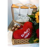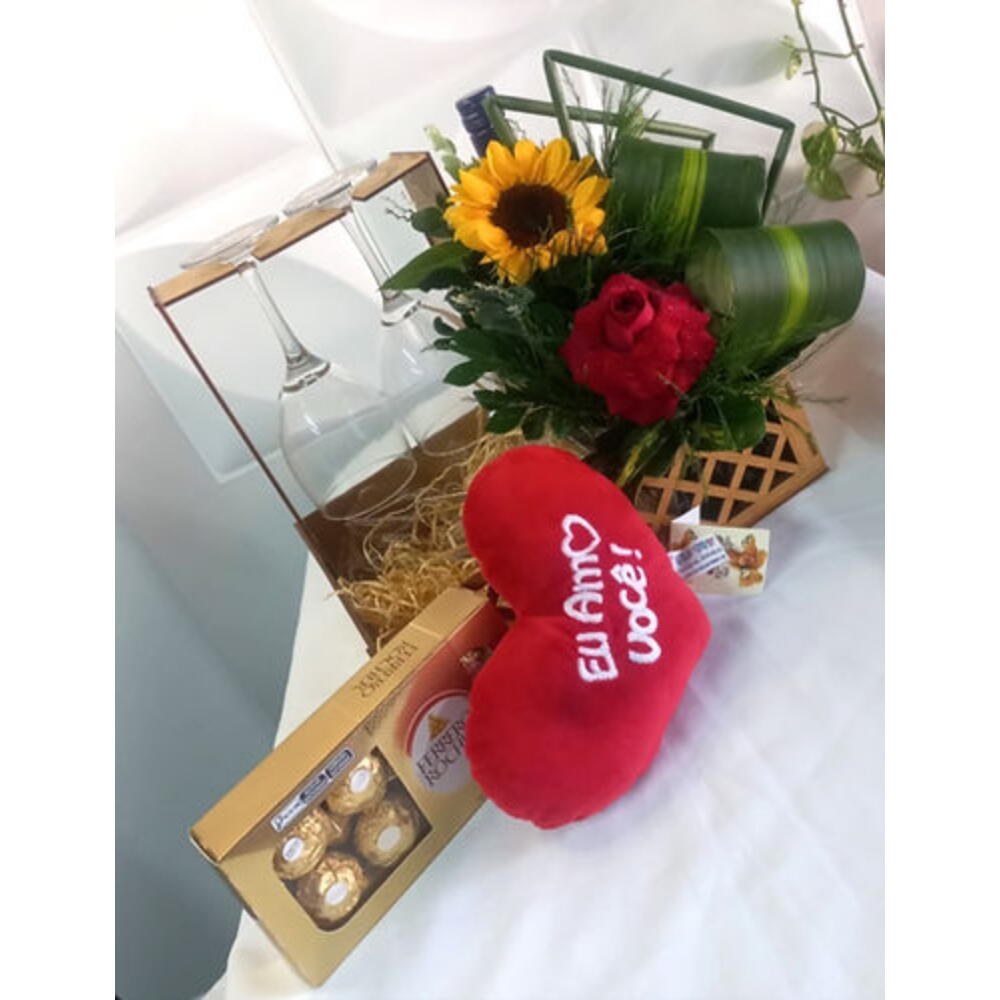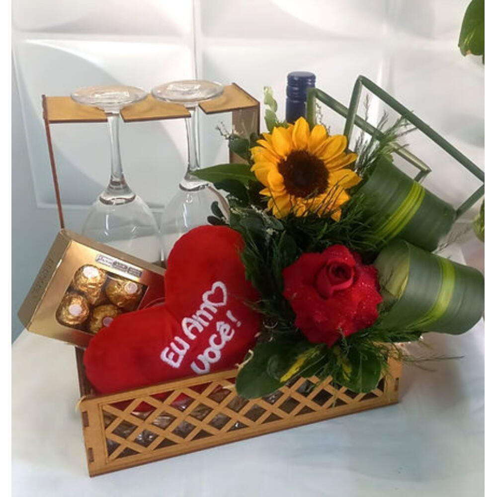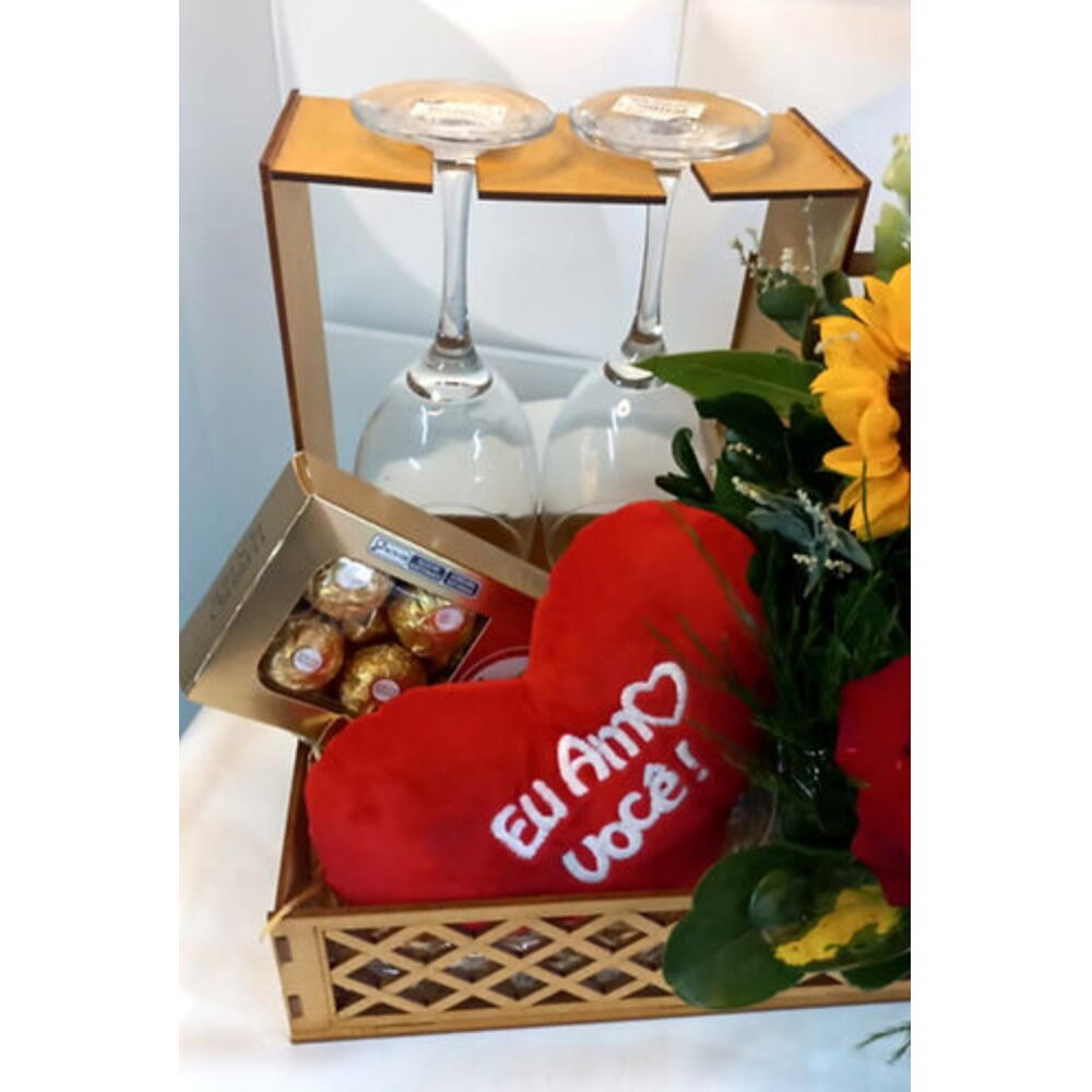 vinho - 1 un. arranjo floral - 1 un. embalagem e laço - 1 un. cesta em mdf - 1 un. taças de cristal - 2 un. caixa de ferrero rocher com 8 - 1 un. coração pelúcia p - 1 un.