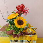 embalagem - 1 un. cesta - 1 un. girassois - 2 un. balão coração feliz dia das mães - 1 un. biscoto e suco - 2 un.