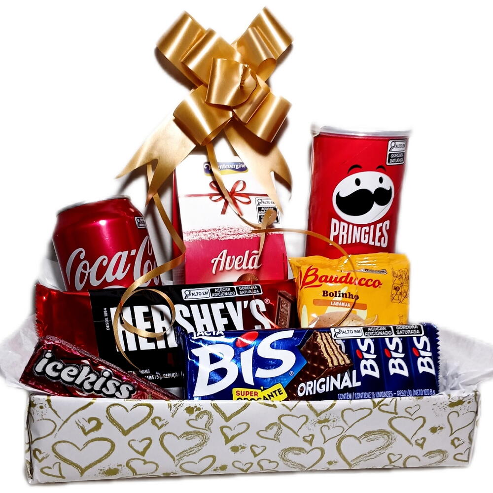 Perfeito para um aniversário de namoro, para pedir perdão ou simplesmente para lembrar que o amor está no ar. Se você quer arrancar suspiros e garantir um abraço apertado, este é o combo ideal. Peça o seu agora e celebre o romance! Contém: *Batata Pringles 104g *Caixa c/4 bombons Avelã Montevergine 55g *Coca-Cola 350ml *Barra Hershey 80g *Bis Tradicional 100g *Icekiss *Bolinho Bauduco 40g. Embalado com celofane transparente e laço. Garanta o seu agora!