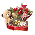 cesta vime - 1 un. arranjo com 6 rosa vermelhas e astromelias - 1 un. urso pelucia 18 cm - 1 un. cx. chocolates ferrero rocher 100g - 1 un.