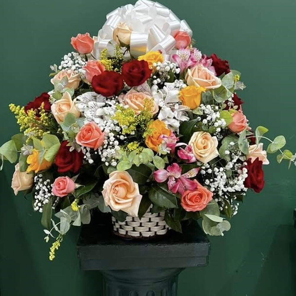 Este deslumbrante arranjo de flores é composto por coloridas rosas que contrastam maravilhosamente com a chuva de prata e a folhagem verde. Apresentado em uma cesta redonda delicada e embelezada com um laço charmoso, este arranjo é o presente perfeito para qualquer ocasião. Não há maneira mais graciosa e elegante para transmitir seus sentimentos mais sinceros.