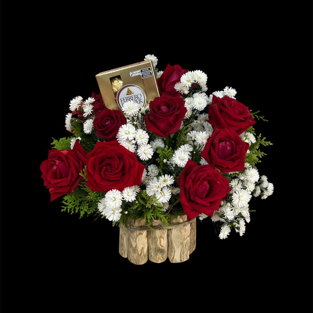 Apresentamos um belíssimo presente com delicados sabores e aromas. Este conjunto é composto por um lindo cesto de flores com 10 unidades, representando a beleza da natureza. Acompanha um suculento Ferrero Rocher, entregando sabor inigualável em apenas uma unidade. O presente é complementado com uma unidade de folhagem e finalizado com um cachepô que adiciona um charme extra ao presente. Ideal para aniversários, datas comemorativas ou simplesmente para expressar o seu carinho. Uma mistura perfeita entre sabor e delicadeza.