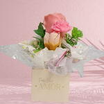 Surpreenda quem você ama com um presente que desperta os sentidos. Este arranjo exclusivo combina a beleza eterna de uma vela em formato de vela de botão de rosa com aroma premium que traz beleza e durabilidade, a delicadeza de uma mini flor de cera de coco aromática premium, pronta para perfumar o ambiente. Apresentado em uma delicada box com a mensagem Para Você, AMOR, o kit é finalizado com um luxuoso laço dourado e folhagens decorativas que transformam este mimo em uma verdadeira obra de arte. É o gesto perfeito para dizer você é especial de uma forma iluminada e perfumada.