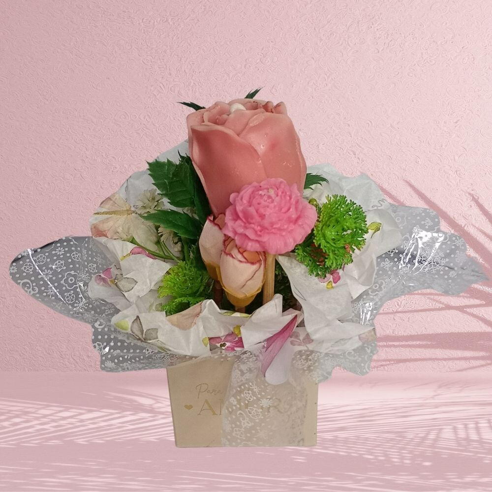 Surpreenda quem você ama com um presente que desperta os sentidos. Este arranjo exclusivo combina a beleza eterna de uma vela em formato de vela de botão de rosa com aroma premium que traz beleza e durabilidade, a delicadeza de uma mini flor de cera de coco aromática premium, pronta para perfumar o ambiente. Apresentado em uma delicada box com a mensagem Para Você, AMOR, o kit é finalizado com um luxuoso laço dourado e folhagens decorativas que transformam este mimo em uma verdadeira obra de arte. É o gesto perfeito para dizer você é especial de uma forma iluminada e perfumada.