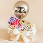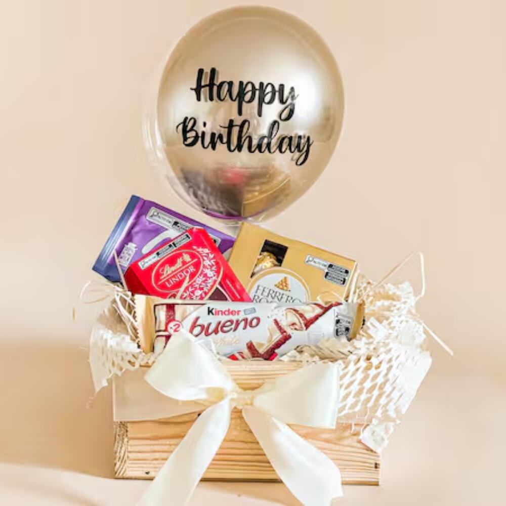 Este presente sofisticado é perfeito para os amantes de chocolate e celebrações. Em uma caixa de madeira resistente, elegantemente decorada com fita de cetim palha e seda, apresentamos um conjunto maravilhoso de chocolates gourmet de alta qualidade. Dentro, você encontrará um Chocolate Importado Lindt (37g), uma irresistível Barra de Chocolate Milka, uma requintada Caixa de Ferrero Rocher (50g) e o amado Kinder Bueno. E para tornar este presente ainda mais especial, incluímos um lindo Balão Mini Bubble na cor Champanhe com a frase Happy Birthday de 20cm. Esta combinação de doces deliciosos e um toque festivo é a escolha perfeita para deixar qualquer aniversariante com um sorriso no rosto.