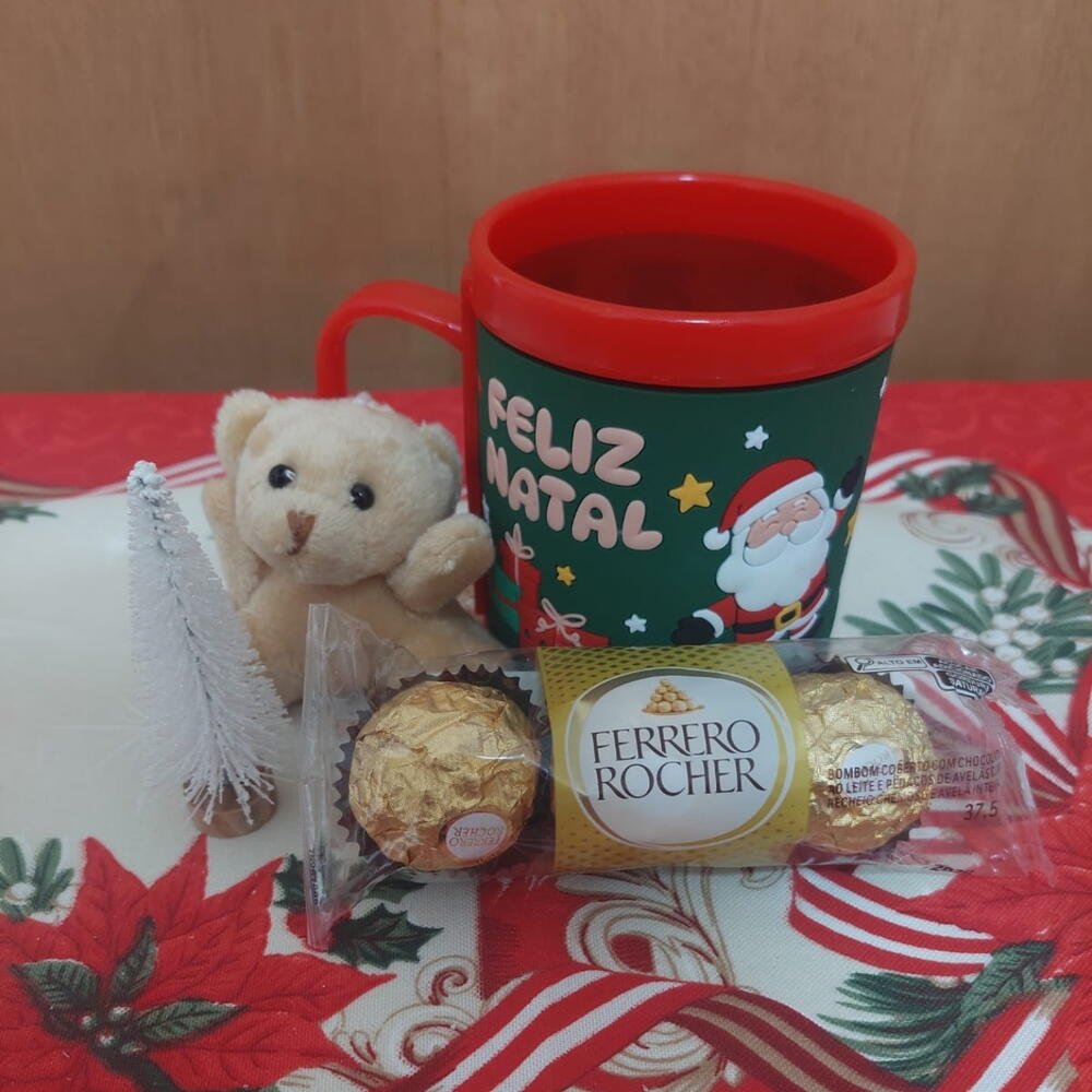 Nossa Caneca Natalina de volta após mais 1 ano. Nossa Caneca é puro charme e acompanha dentro 1 Ferrero de 3un, 1 Ursinho de Pelucia/Chaveiro charmoso e 1 mini árvore Natalina para você enfeitar sua casa na época mais feliz do ano. Peça já a sua!