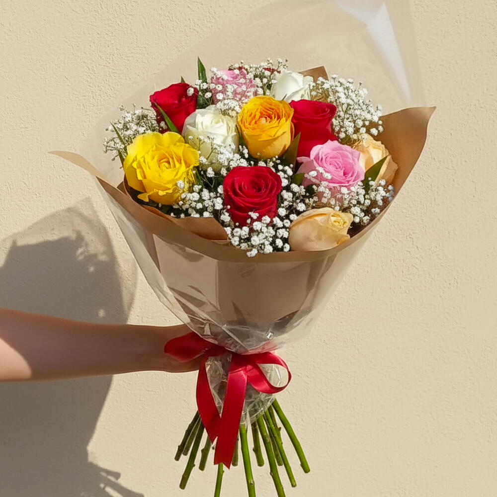 Um buquê alegre e vibrante, composto por rosas variadas, criando uma explosão de tons que representam amizade, alegria e entusiasmo. As flores são harmoniosamente dispostas e finalizadas com um toque delicado, perfeito para celebrar momentos de felicidade e diversão.