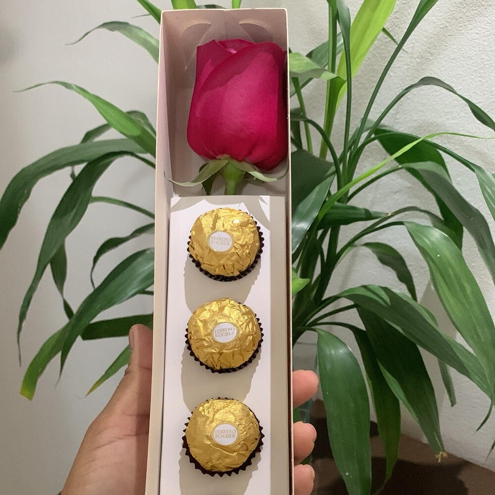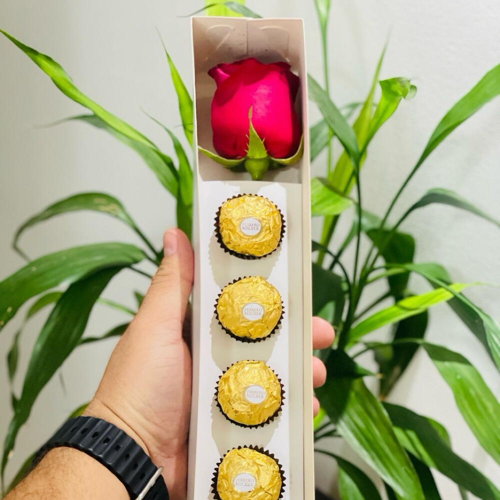 Presenteie alguém especial com uma bela combinação de fragrância e sabor. Este presente inclui uma única rosa, simbolizando seu apreço único e irrefutável. Acrescentamos uma tentadora seleção de 6 unidades de Ferrero Rocher, para adicionar um toque de doçura requintada à surpresa. Tudo isso é cuidadosamente embalado em uma embalagem personalizada, refletindo o estilo e a sofisticação de quem está presenteando. Obs: Estampas da caixa podem variar conforme disponibilidade.