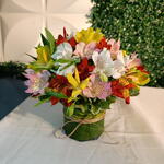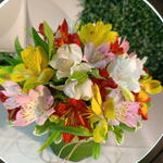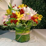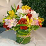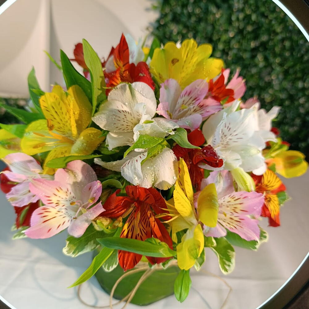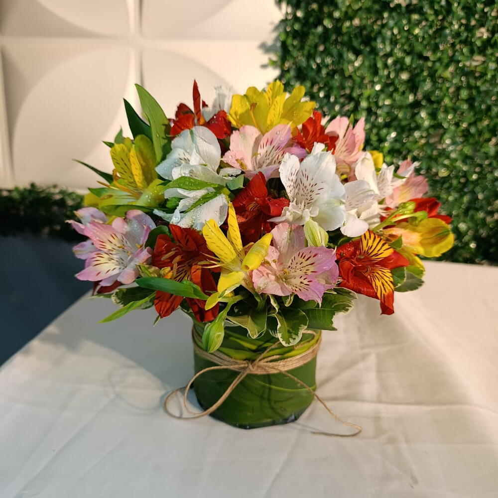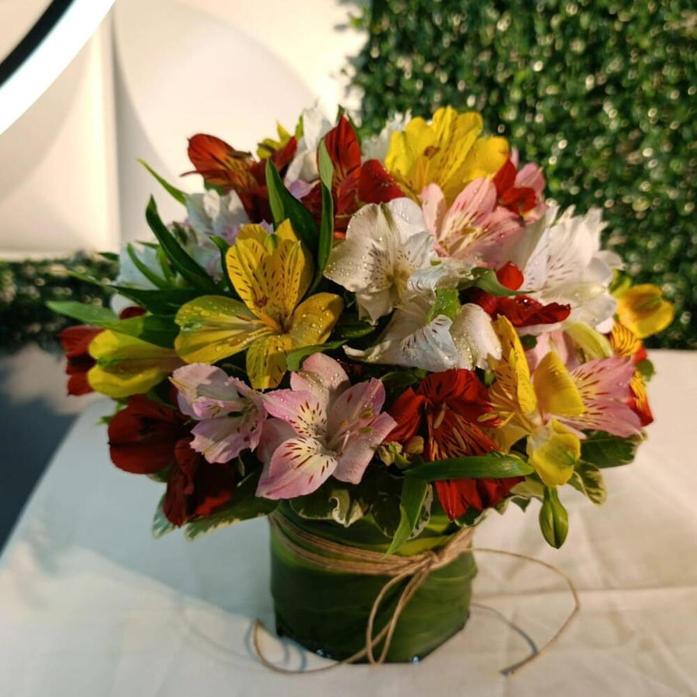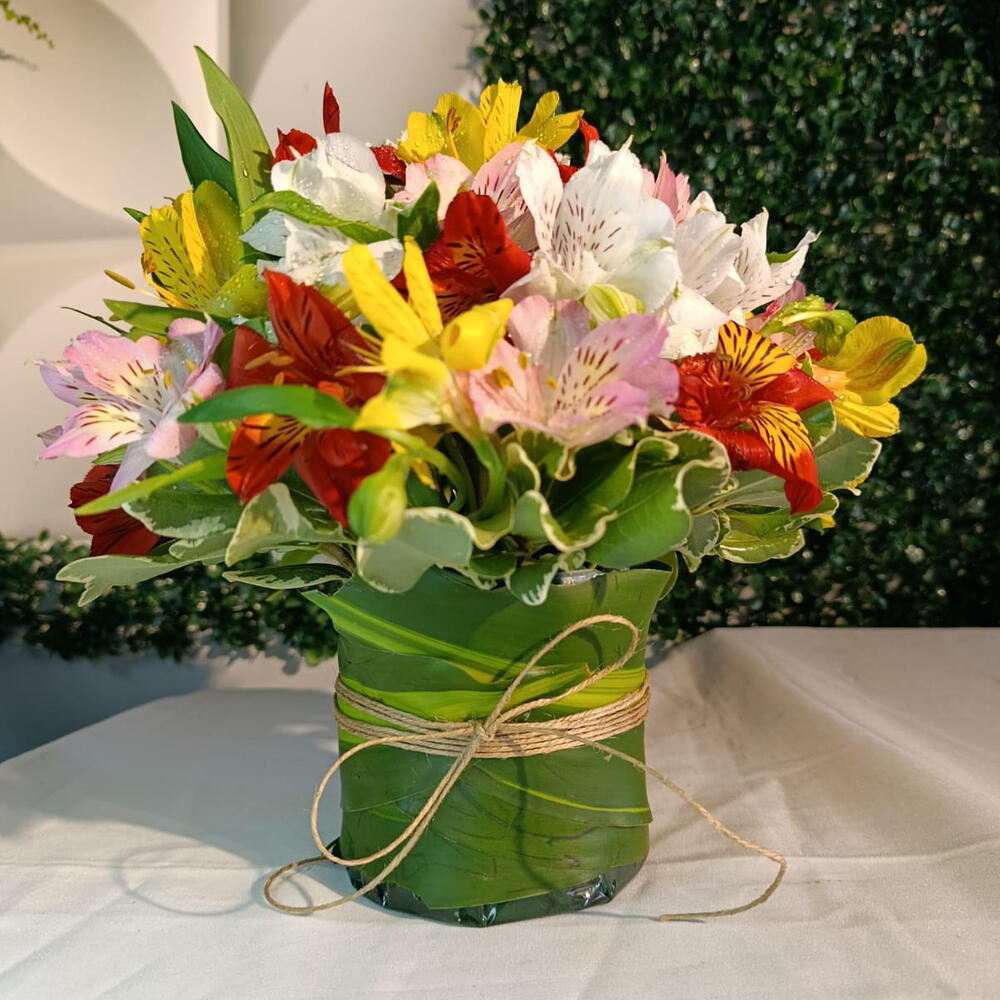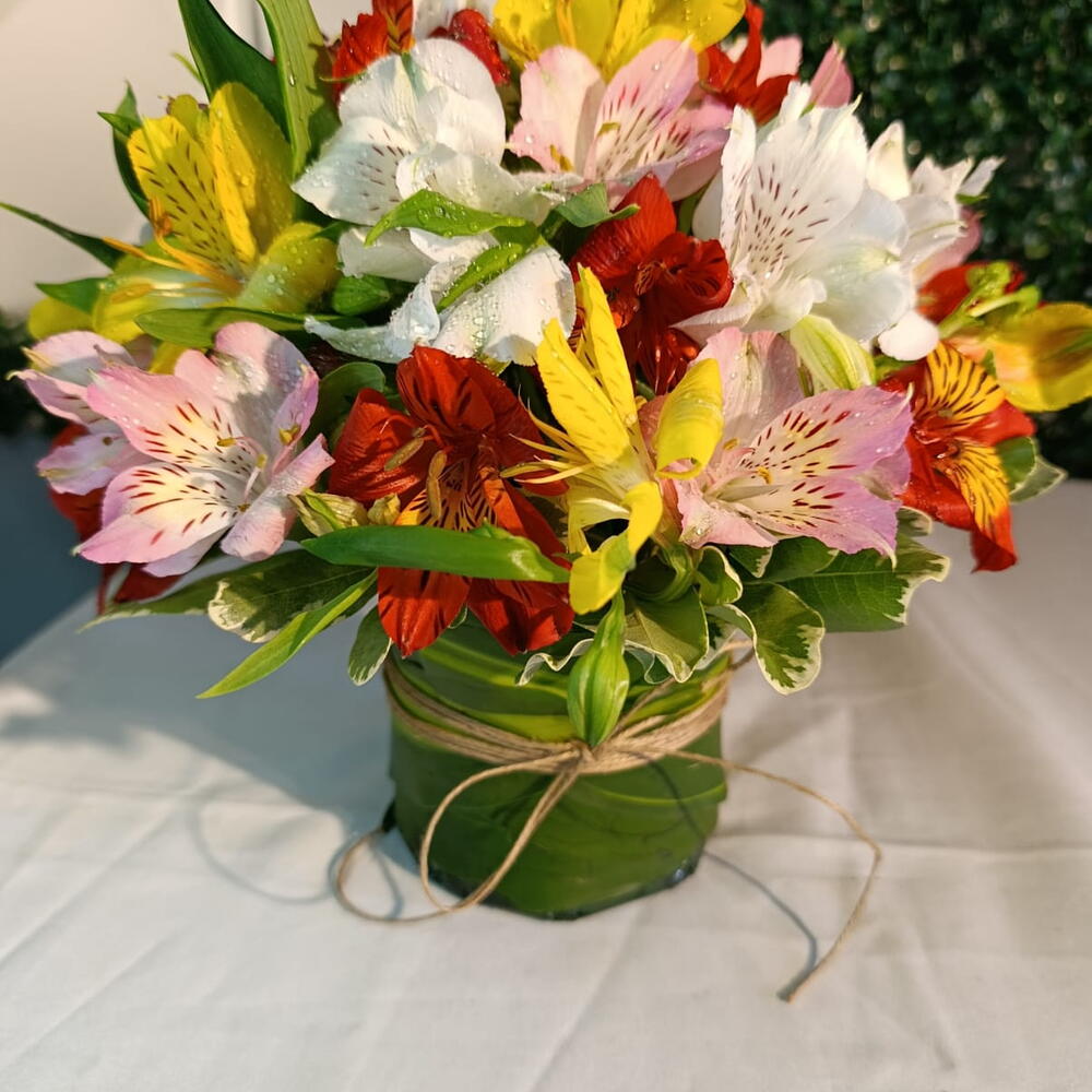Um lindo arranjo feito na base floral envolvido com folhagem e fita sisal, com varias flores de astromélias coloridas.