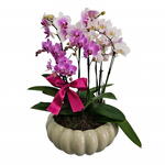 Um arranjo de 3 mini orquídeas em um vaso decorativo colorido.
