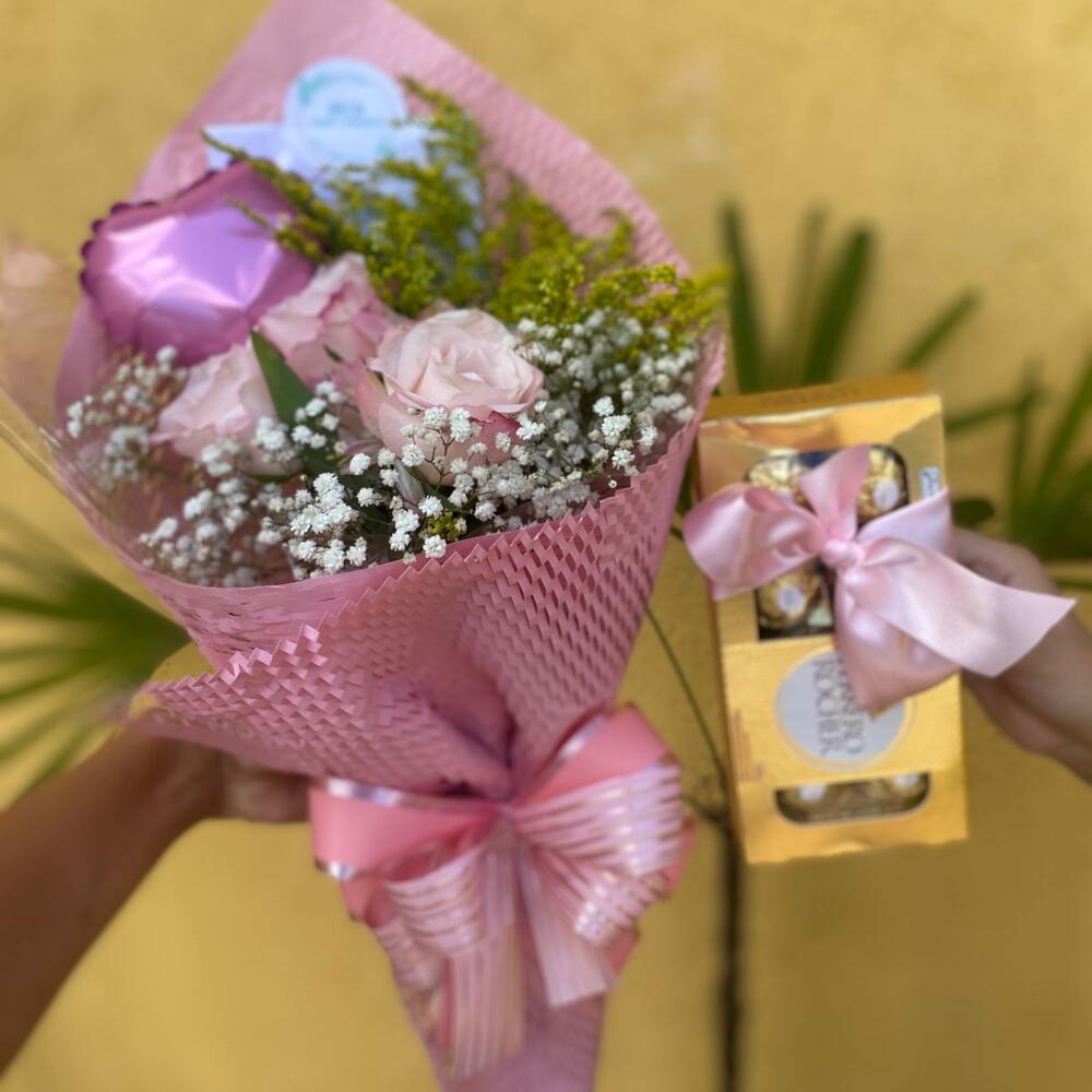 rosa - 3 un. embalagem - 1 un. folhagens - 1 un. laço - 1 un. caixa de ferrero rocher - 1 un. mini balão - 1 un. laço em cetim - 1 un.