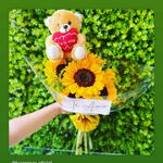 Este elegante buquê é composto por 6 encantadores girassóis, realçados por 1 unidade de folhagens verdes luxuriantes. Cada buquê é habilmente embalado em uma embalagem atraente e finalizado com um laço delicado, tornando-o o presente perfeito para qualquer ocasião. Este buquê é uma expressão atemporal de amor e carinho.