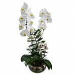 Um arranjo de orquídea phalaenopsis plantada contendo, 1 orquídea grande 2 hastes, 1 mini orquídea 2 hastes e uma zamioculca em um vaso de mexirica com cascalho.