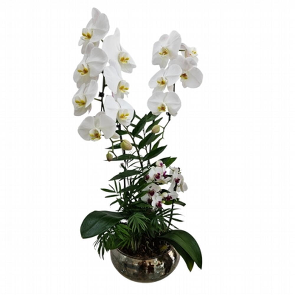 Um arranjo de orquídea phalaenopsis plantada contendo, 1 orquídea grande 2 hastes, 1 mini orquídea 2 hastes e uma zamioculca em um vaso de mexirica com cascalho.