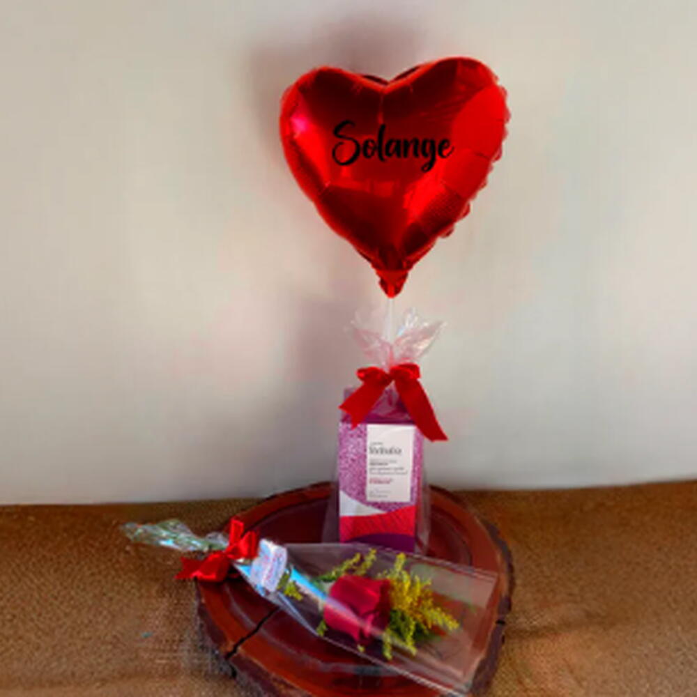 rosa vermelha - 1 un. balão - 1 un. cartinha com sua mensagem - 1 un. caixa com 5 sabonetes natura todo dia - 1 un. balão metalizado adesivado com nome - 1 un.