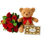 Este combo luxuoso oferece um buquê de flores deslumbrantes, brinquedo de pelúcia fofo e deliciosos chocolates - três unidades para satisfazer todos os sentidos. Ideal para presentear alguém especial e expressar seu amor e apreço. Unamos o tradicional e o doce num só combo para tornar qualquer ocasião inesquecível.