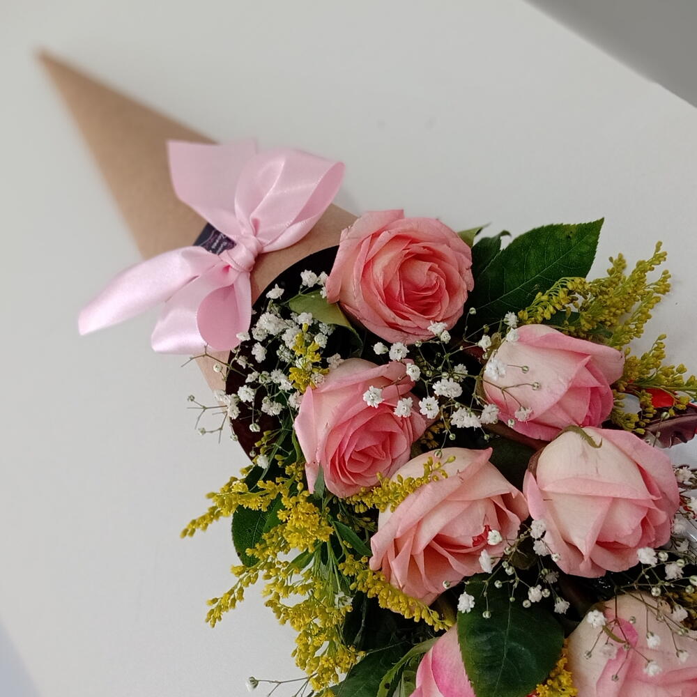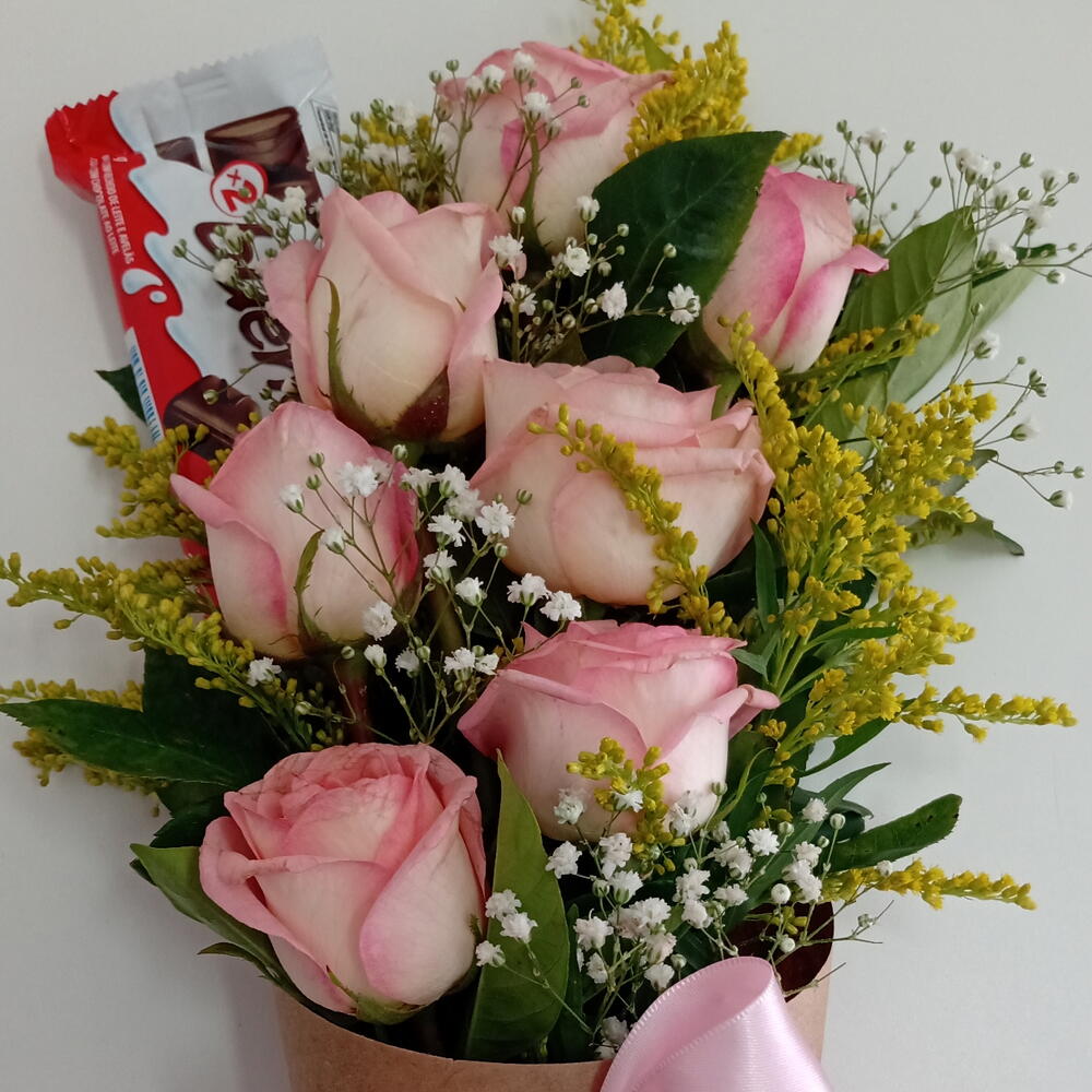 Desperte seus sentidos com estas elegantes Rosas. Este pacote contém um cone de papel kraft para um toque rústico e artesanal. O conjunto também é decorado com sete exuberantes rosas de qualquer cor à sua escolha, adicionando um toque romântico e vibrante. Além disso, o conjunto inclui um chocolate Kinder Bueno para acrescentar uma nota doce à sua surpresa. A combinação perfeita para qualquer ocasião.